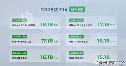 6月18号零跑出了新C16,起价15.18万。这次出了纯电和增程两种,能选5座或者6座。主要变动力和续航,电池更大了,纯电版能跑630公里,比以前多不少。外观没大改,还是那样子,不过细节有调整。
